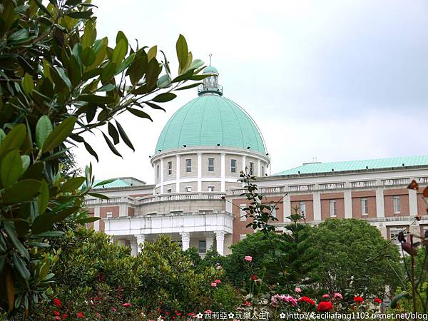 ▼從玫瑰花田望去,遠方就是行政大樓暨增連圖書館,這棟建物怎麼看也看不膩。