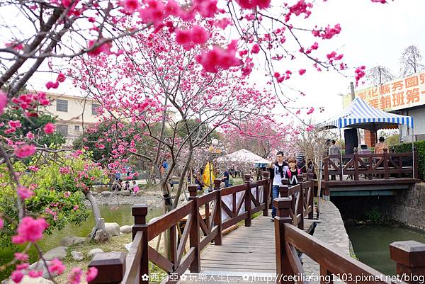 ▼接著讓我們走進園區裡面,園區內有個大水池,而眼前的木棧道則是被盛開櫻花們