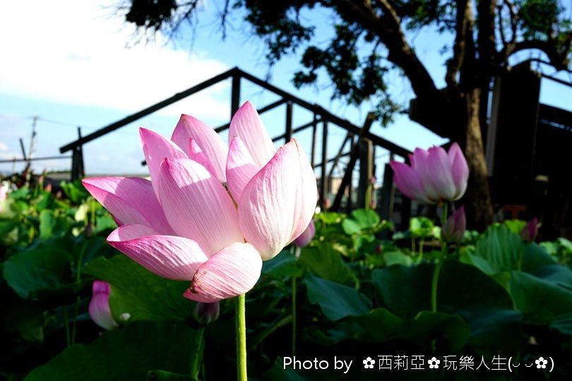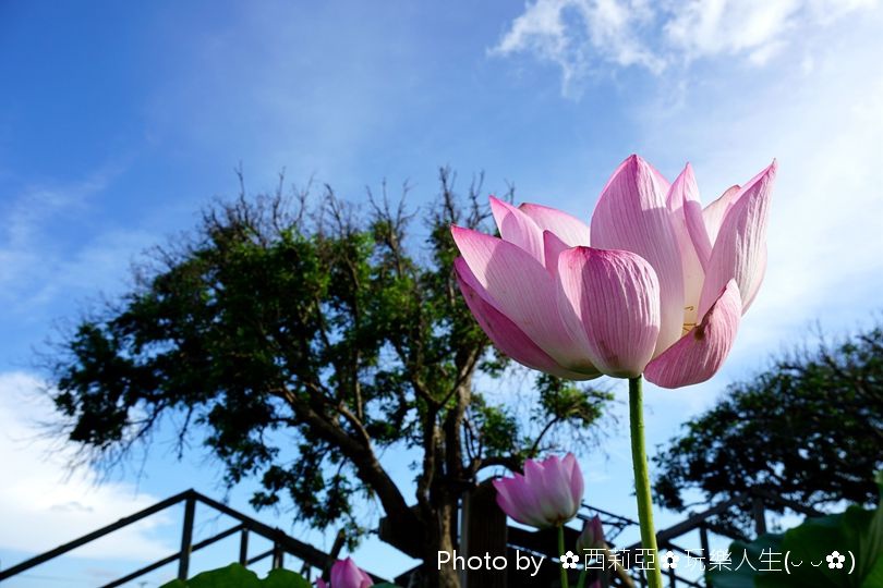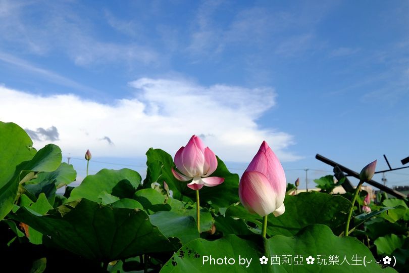 ▼謝謝上天許我這麼一個大藍天,蔚藍天空配上粉嫩荷花,形成眼前這一幅初夏的美好畫面。