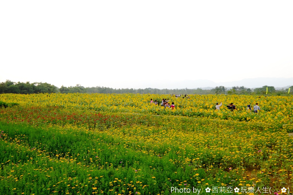 光眼前杉林大橋一旁的向日葵與波斯菊花田,就讓西姐一整個驚豔不已囉,因為賞花真的要靠運氣,瞧這金黃色向日葵......