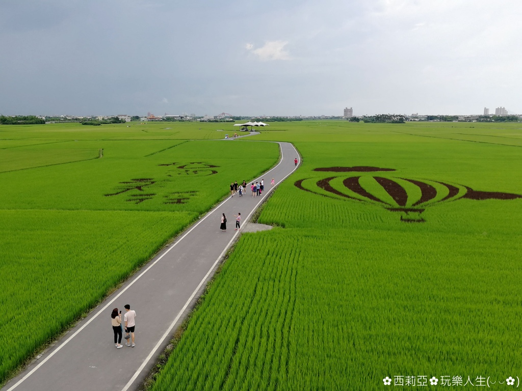 ▼登上觀景高台首先映入眼簾的是眼前全長約 2公里寬約 5米,田間蜿蜒小路一望無際翠綠水稻田。當然還有這次活動的嬌點,那就是熱氣球及稻間美徑四個大字的彩繪稻田喔。