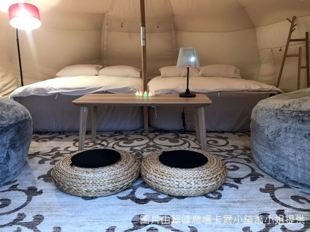 ▼而卡爾小鎮蓮花帳設備有雙人或四人床、懶骨頭大沙發、咖啡桌、小冰箱、浪漫燈座....
