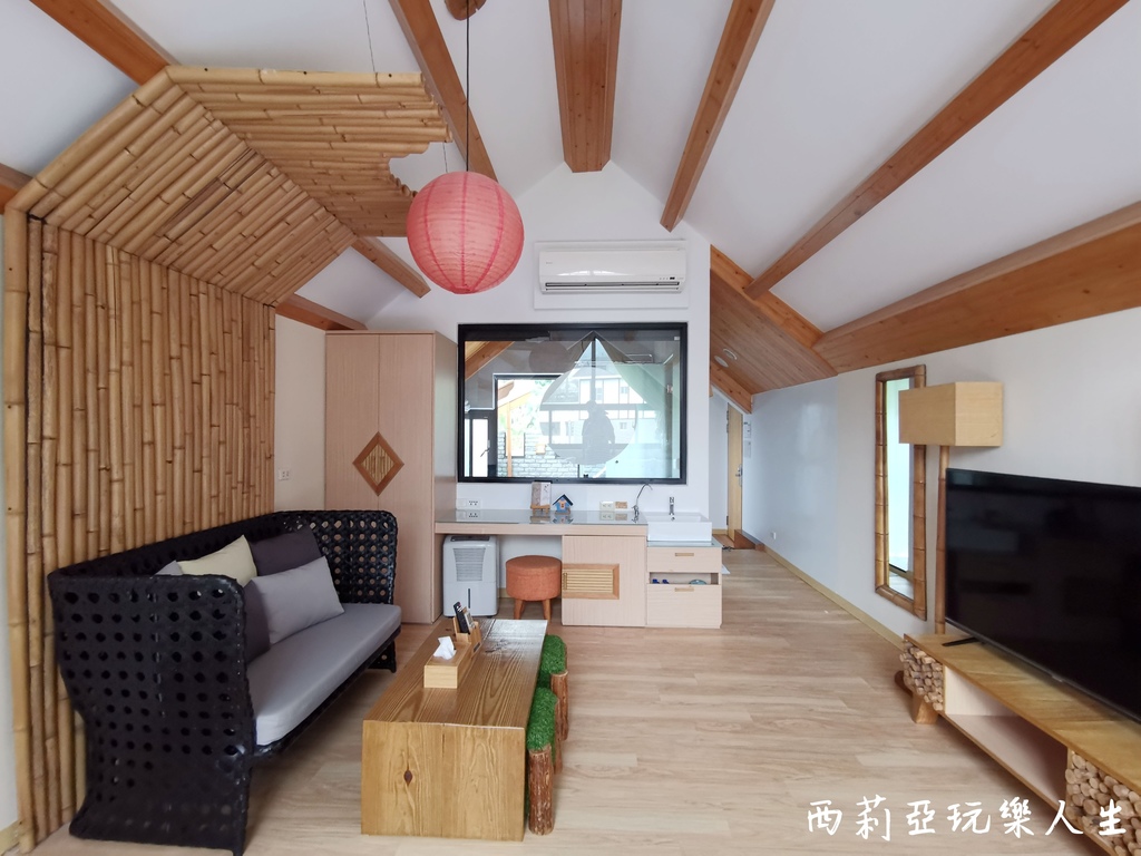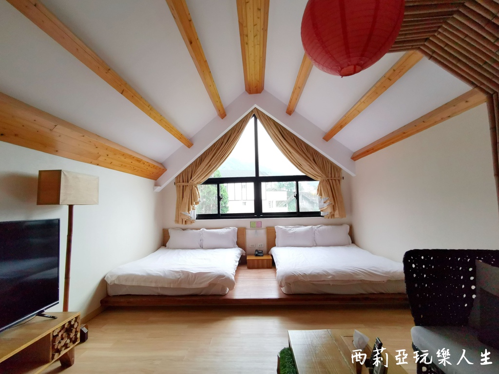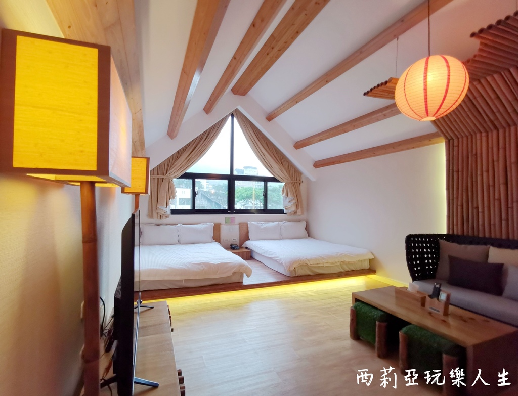 ▼待西莉亞推門進去換了雙拖鞋之後.....登勒!映入眼簾的就是邊城四人房主臥格局,主臥格局設計簡約質樸,主要以木頭及竹筒為主要素材。因為二樓也是頂樓,所以斜屋頂設計更增添些許迷人丰采。