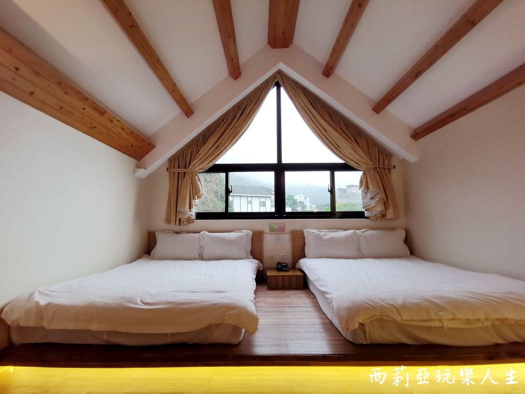 ▼西莉亞特此前往IG看看網美網帥們如何利用影像表現聽濤園迷人之處,原來大家都喜歡在圖中兩張床之間擺出許多美好畫面呢。另外天花板上方數條原木設計,似乎想要表達邊城四人房樸實低調的面向....