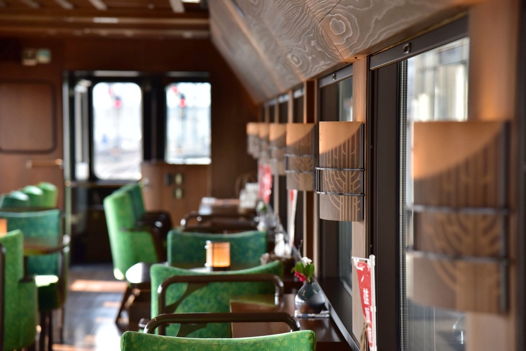 ▼其中3號車廂「秋彩之章」設計靈感,就來自於千年物語列車行駛過許多山脈隧道,儘管車窗外的景色被遮擋,但透過溫暖的照明設計,讓人聯想起夜晚中壁爐裡的燈火,營造出一種溫暖的氛圍。