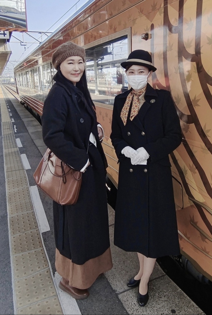 ▼千年物語列車組員親切迎賓、列車外觀繽紛色彩、內裝古樸典雅、四國在地食材料理更是美妙。領隊小呂熱情地為大家拍照留念,親切引導及說明列車內外值得欣賞的視野,每一幅畫面都值得細細品嚐。