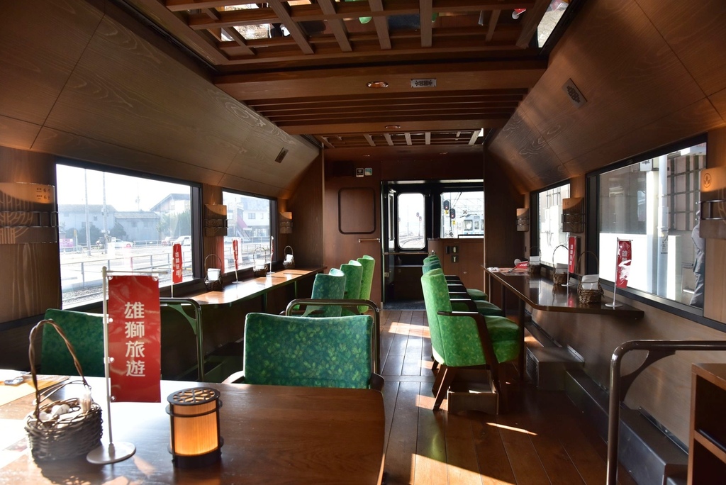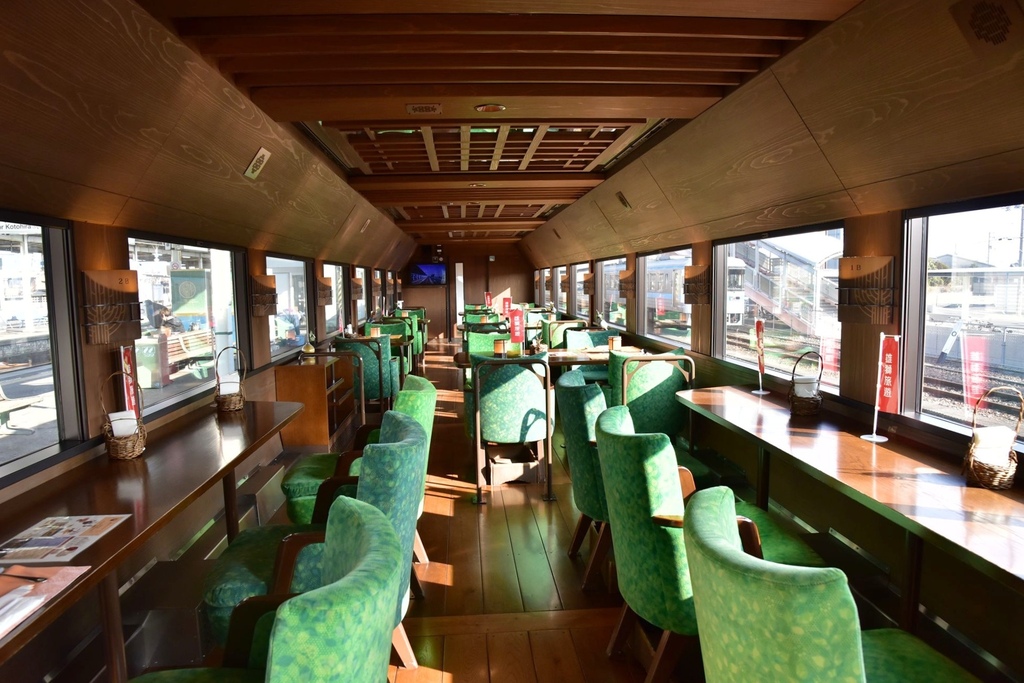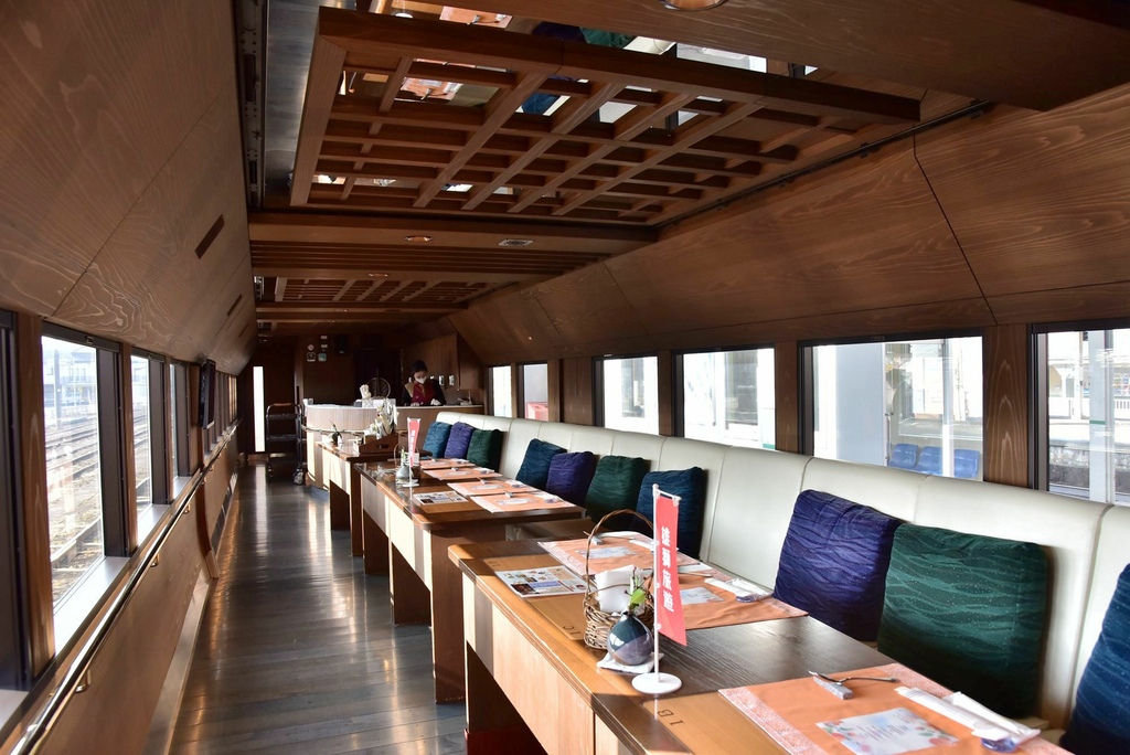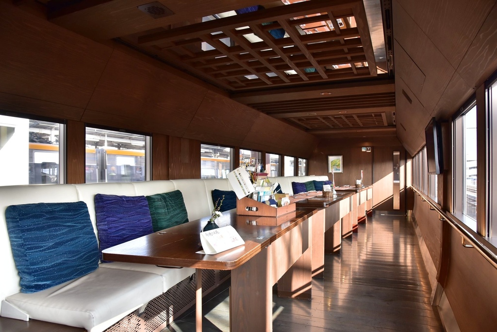 ▼四国まんなか千年物語列車其設計概念為「大人的遊山」,起源於德島人會於女兒節時準備豐盛的便當前往山、海遊玩一天,並稱其為「遊山」,而千年物語則是將遊山的意象,加入摩登時尚的元素演繹而成。