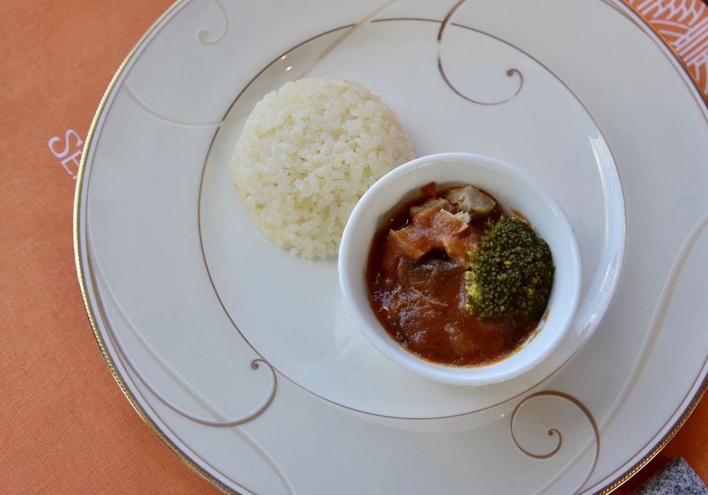 香川縣產越光米濃郁米香飽含彈性的口感,搭配著番茄燉橄欖豬與白腰果這道料理,其口感風味極佳。