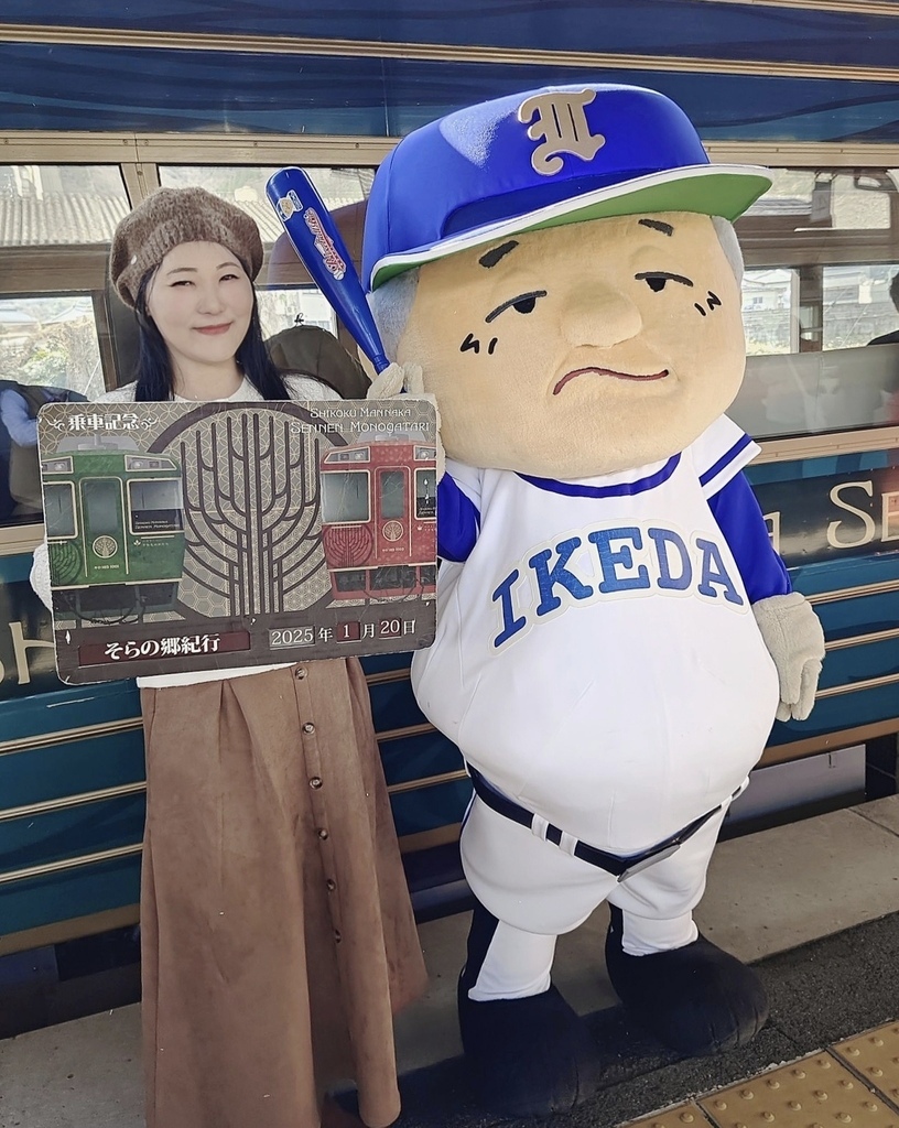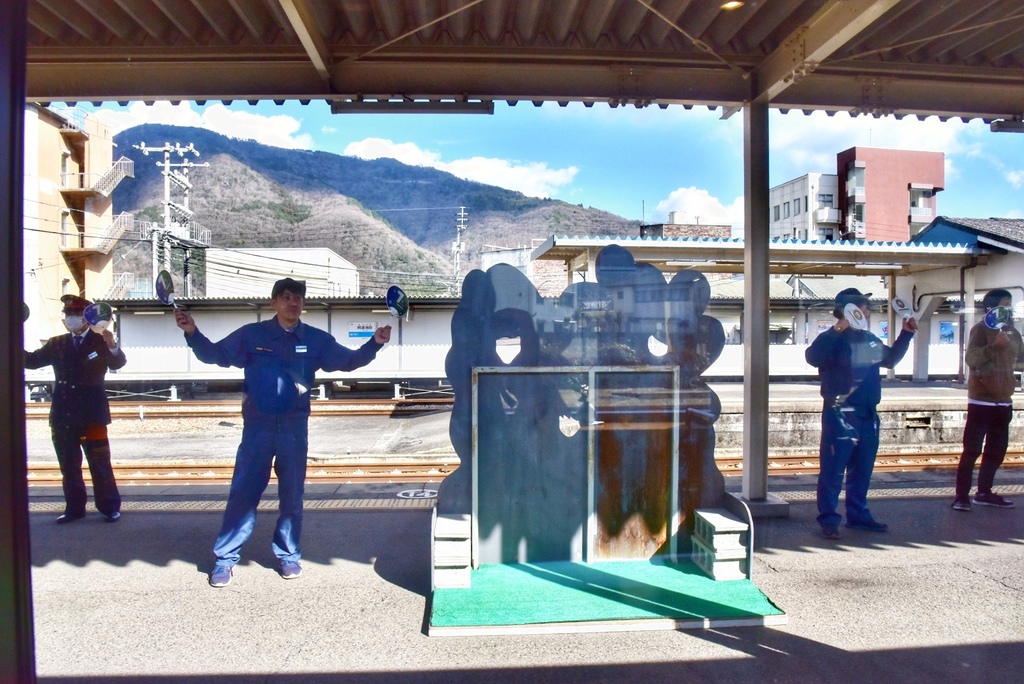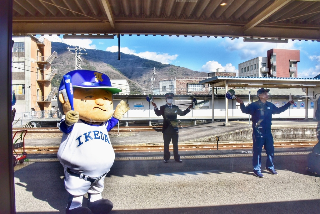 阿波池田駅月台迎接我們的是熱情的站務人員們,以及呆萌站在一旁的蔦監督吉祥物,我們在這裡穿著站長服裝拍照留念,還有蔦監督超厭世表情好可愛,讓站在一旁的我笑開懷..