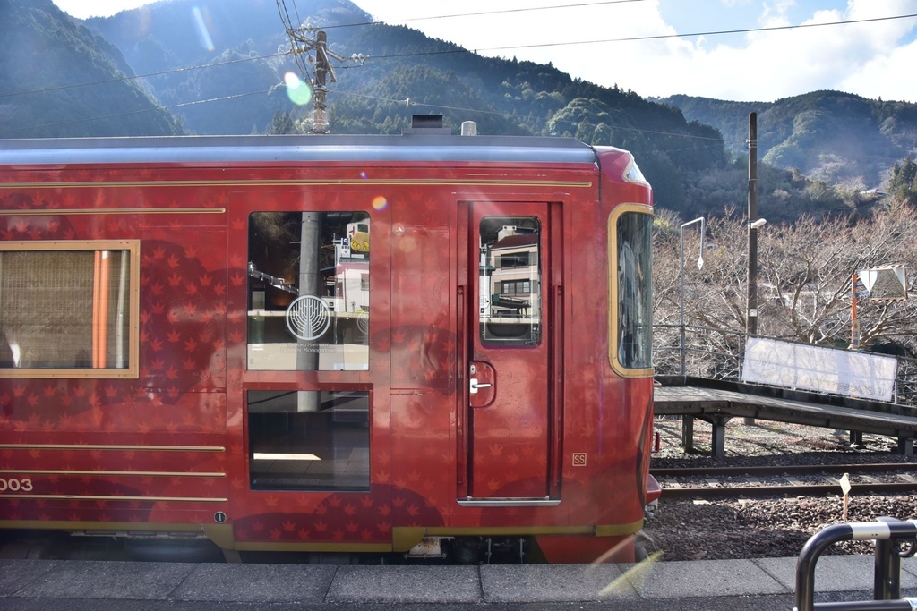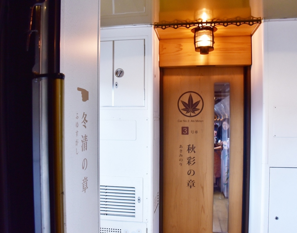 ▼這次我們入座於3號車廂「秋彩之章」,紅色車廂讓人聯想到秋季染上秋色的群山紅葉。