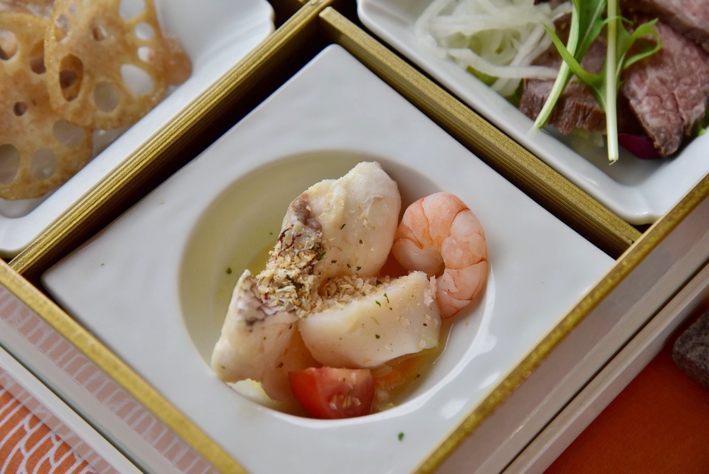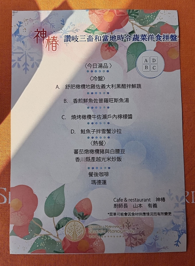 讚岐三畜搭配當地時令蔬菜洋食拼盤分成ABCD四種料理,A.舒肥橄欖地雞佐義大利黑醋伴鮮蔬,B.香煎鮮魚佐普羅旺斯魚湯,C.燒烤橄欖牛佐瀨戶內檸檬醬,D.鮭魚子拌雪蟹沙拉。