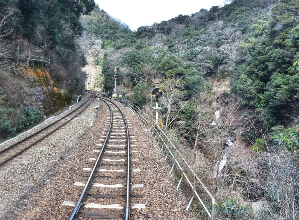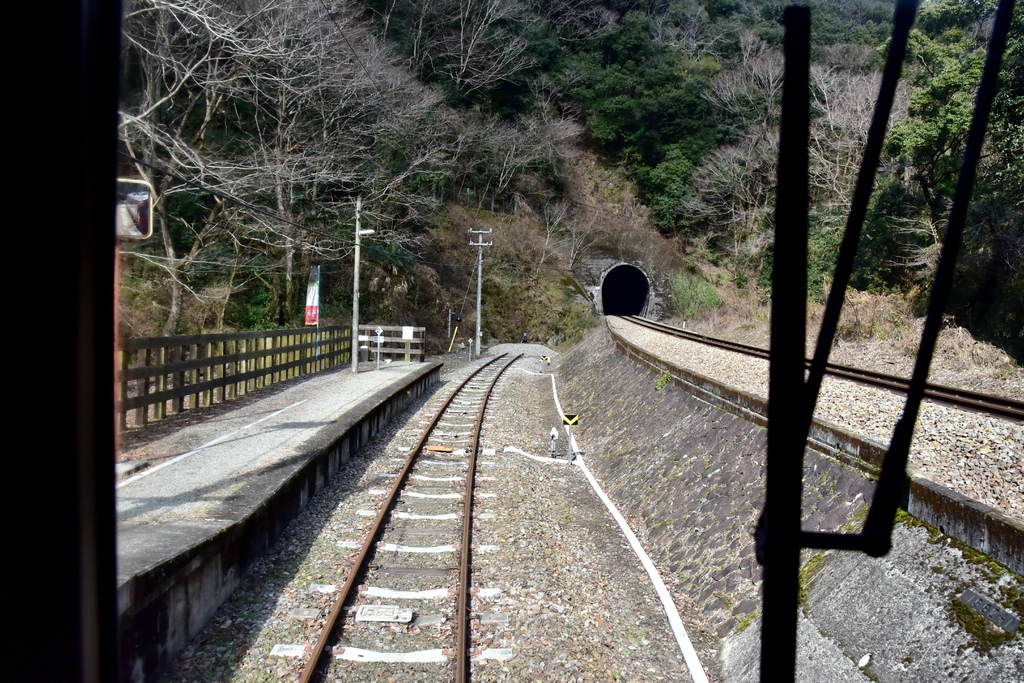 ▼坪尻駅擁有一座古老木造站房且周圍人煙稀少,四國知名的秘境車站之一,其本身還是一個折返式車站,坪尻駅前方的鐵路軌道,左邊(停站用)明顯比右邊(通過軌)低,右前方就是則是穿越豬之鼻峠(猪ノ鼻峠)的「豬鼻隧道」(猪鼻トンネル)。
