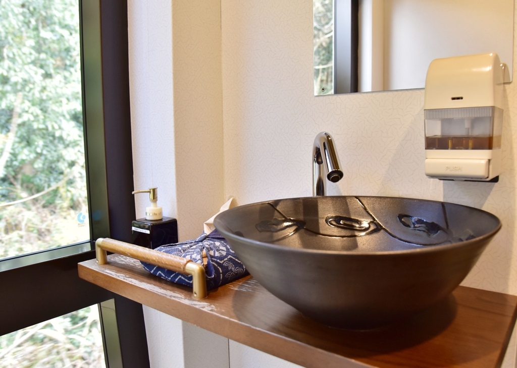 ▼千年物語列車特色之一,就是列車上可以看見日本四國的各種傳統工藝作品,例如圖中的鳴門市大麻町大谷燒製作的洗手台、香川漆器點心盤、德島美馬市的和傘、德島藍住町的藍染抱枕..等。