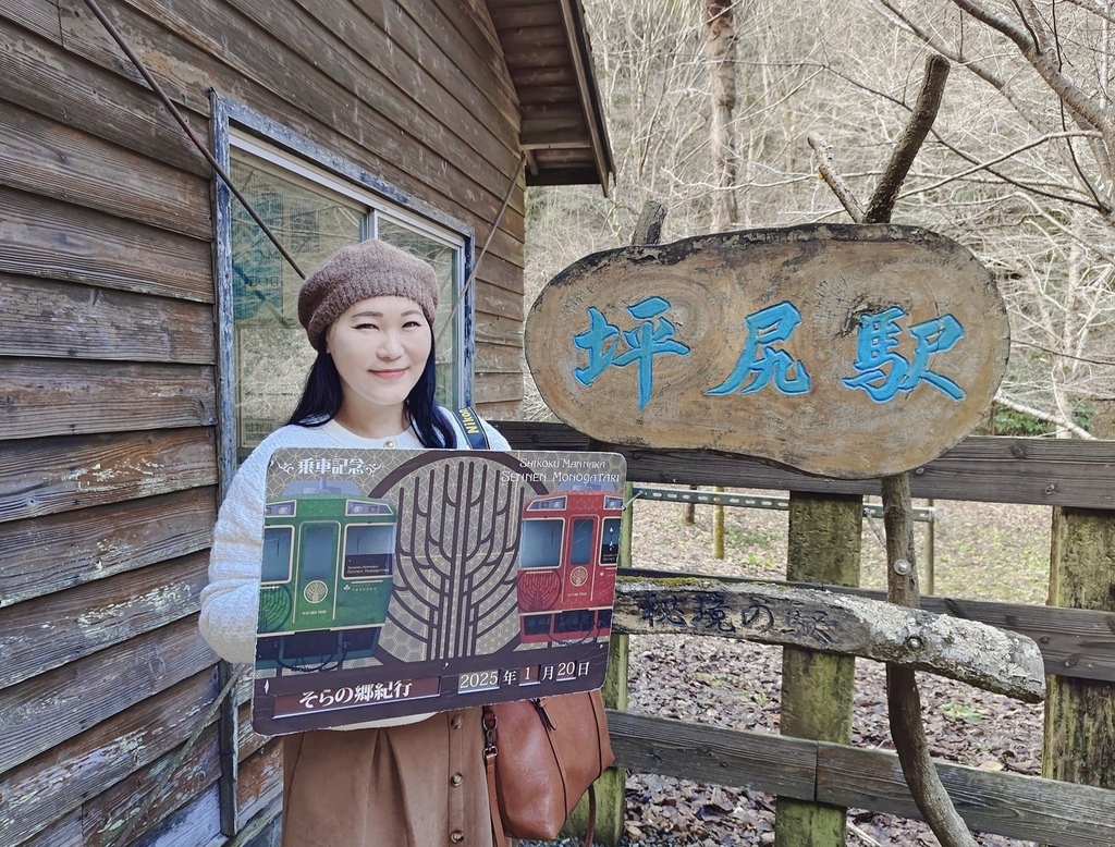 ▼千年物語列車的乘務員,熱情地拿著很有紀念性的坪尻駅紀念牌,我們可以站在「坪尻駅」站牌前留下美好印記。