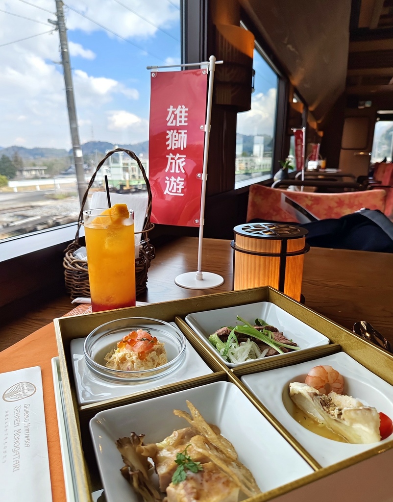 從千年物語列車延伸入內車廂所表達的四季色調,此時窗外隨季節變化的德島風光,再端出四國特色的料理,千年物語確實營造出濃厚且具有獨一無二質感的美好體驗。