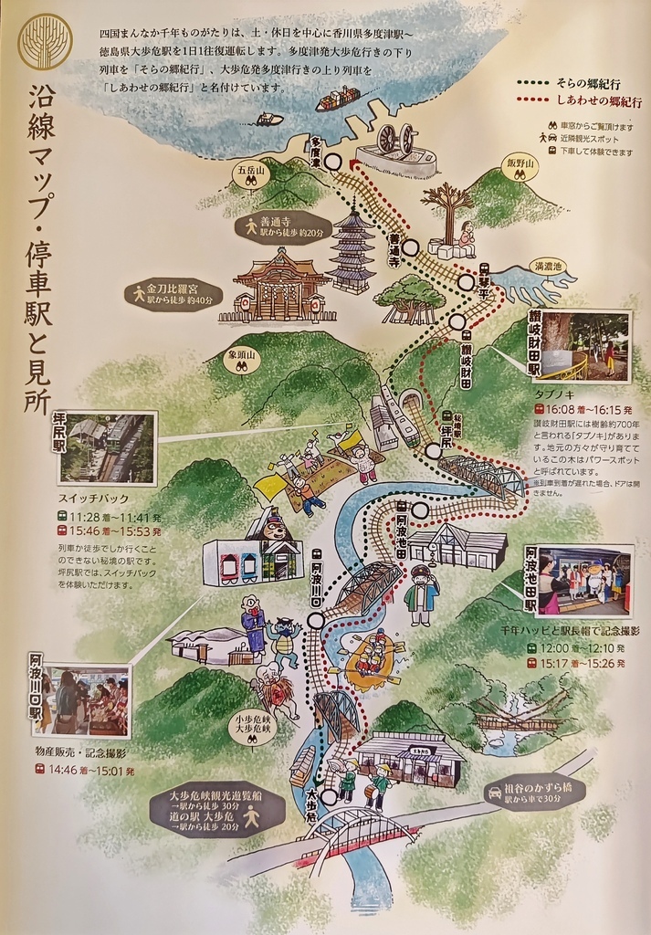 ▼千年物語列車沿線也有許多旅遊景點,包括弘法大師空海的出生地善通寺、以琴平神社和金比羅溫泉而聞名的琴平,還有擁有祖谷葛藤橋的大步危峽谷等。