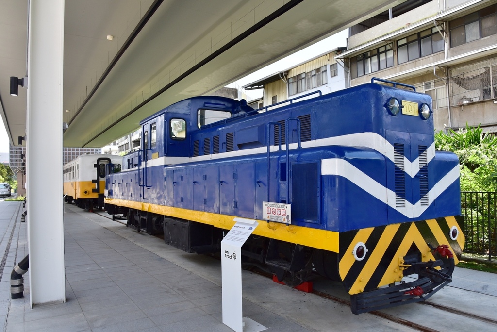 ▼戶外展示區分為兩部分,其中一處展示柴液機車 LDH100 型以及柴客拖車 LTPB1800型等762mm軌距的火車。另一處則展示圖中的紅斑馬電聯車EMU1200型。