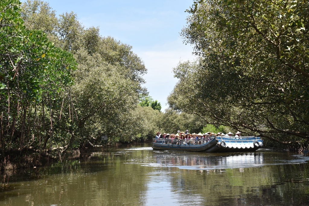 ▼搭乘觀光船遊覽時,船長會提醒我們要注意低矮的樹枝,增添了旅程中的互動與趣味。四草綠色隧道宛如仙境的景象,讓這裡有了「台版亞馬遜河」的美稱,也成為台南最具代表性的自然美景之一。