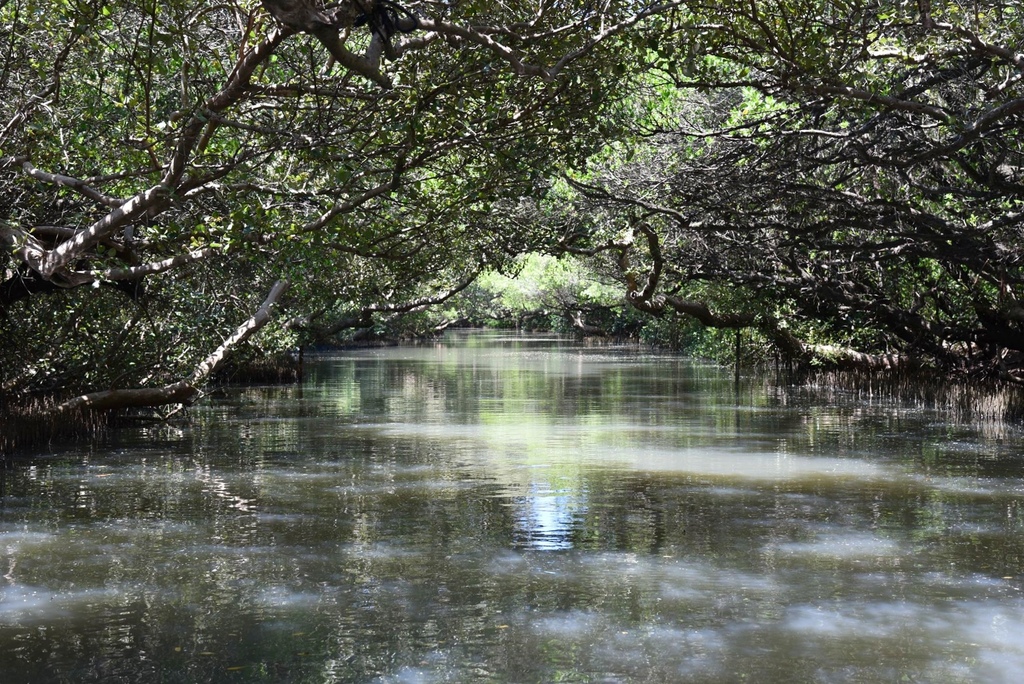▼四草綠色隧道以其獨特的「天使之吻」及「綠色之眼」聞名,這是由沿途茂密的紅樹林與水面倒影相互映照而成的自然奇觀。
