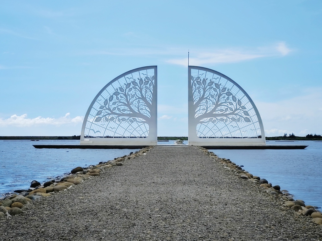 純白的「生命之樹」是藝術家楊士毅的巧思之作,其造型巧妙地融入扇形鹽田的紋理,更蘊含著臺南將軍的在地人文風情。中間的海上步道選用對環境友善的自然材質鋪設,倒映在平靜的水面上,呈現一幅靜謐而唯美的畫面。