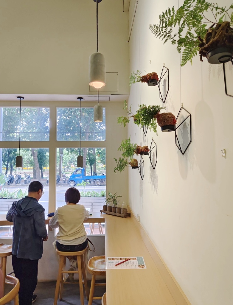 ▼時蒔vegan蔬食麵館室內空間,療癒的文青風格搭配鮮綠的花草點綴,使整體空間繽紛又舒適。