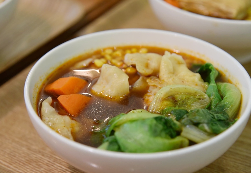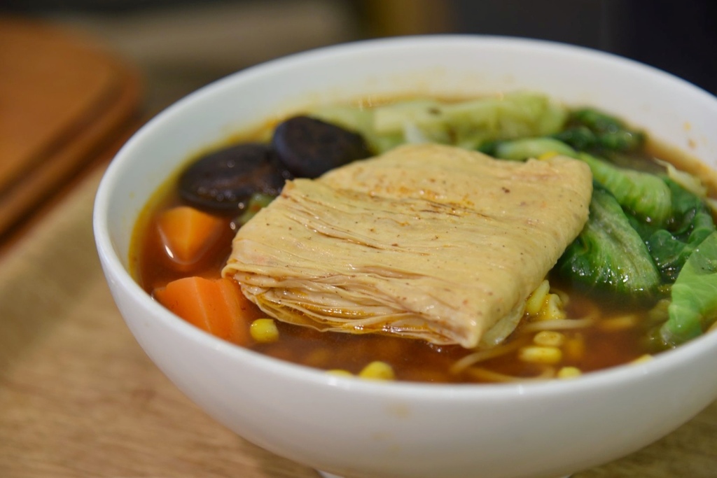 在湯匙舀起第一口麵湯時,就能感受到那份傳承的深厚底蘊。這碗家傳紅燒湯麵,以溫和的中藥湯底為基底,完美顛覆了素食紅燒的刻板印象。它的口感並非一般紅燒的厚重油膩,而是清澈回甘、溫潤順口。隨之而來的是數種中藥材釋放出醇厚與清香,配料有豆皮、玉米與青江菜,搭配Q彈的拉麵超級對味。