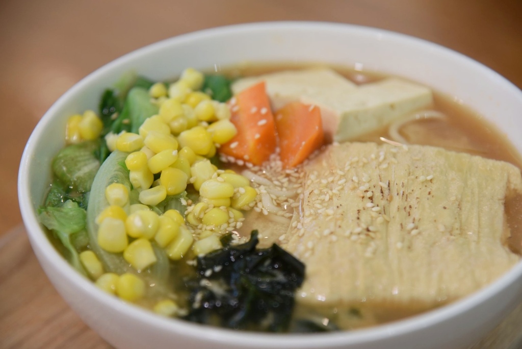 這碗豆包豆乳味噌湯麵,它將日式味噌的溫醇、豆乳的細膩滑順,以及豆製品的高優質蛋白完美結合,帶來一碗清新滋養的暖心湯麵。麵體吸飽了豆乳味噌湯汁,入口柔順。其中最迷人的配角,莫過於吸飽湯汁的豆包。豆包的氣孔將湯頭精華緊緊鎖住,咬下時會爆發出飽滿的湯汁,質地則帶著彈牙的韌性。