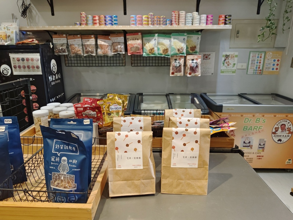 ▼森富寵物生活館室內空間,前方擺放著各種常溫或冷凍的寵物食品。